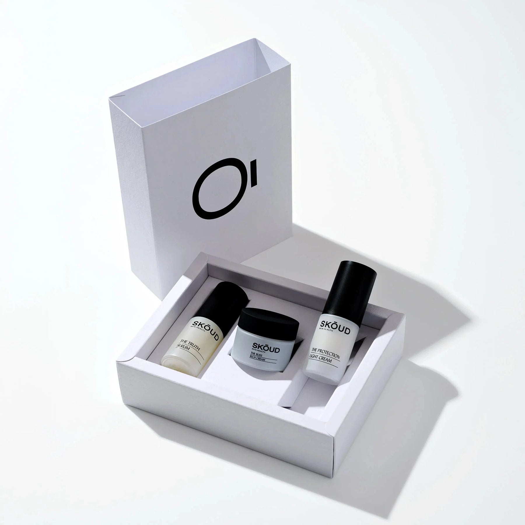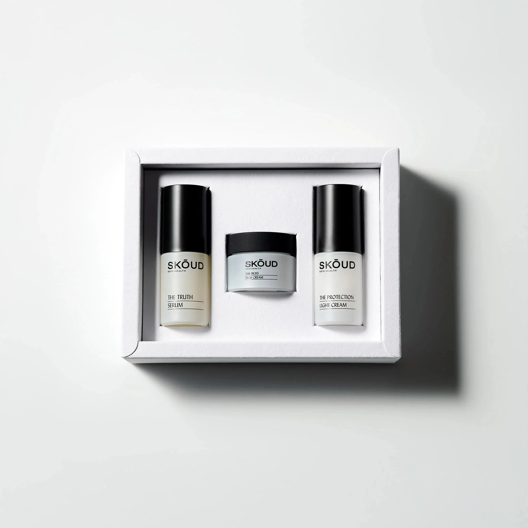 Whether you're just discovering the world of SKŌUD, don't want to miss out on your skincare routine while on the go, or are looking for a thoughtful gift, the SKŌUD Travel Bag is the perfect solution. Compact, effective, and stylishly packaged, this set accompanies you with highly effective essentials for protection, regeneration, and deep-acting care – anytime, anywhere.