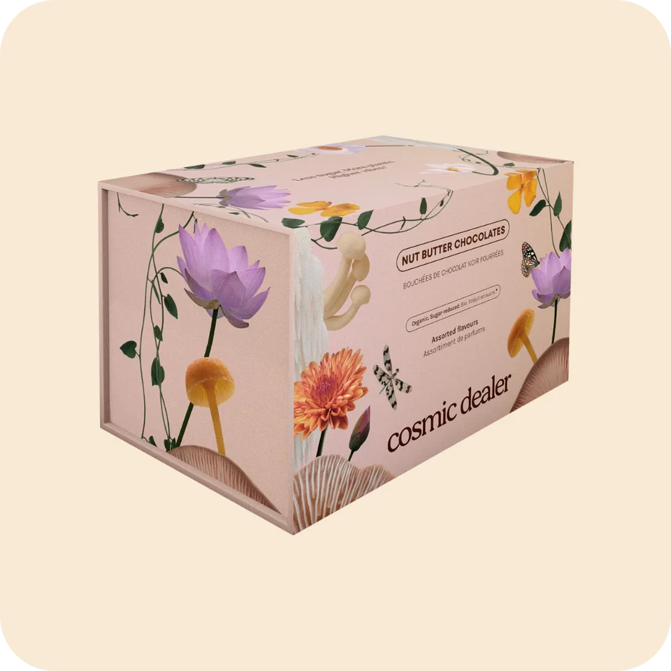 This box contains 14 creamy nut butter pralines in our most popular flavors – refined with botanicals, fruits, and flowers, coated in high-quality dark chocolate.