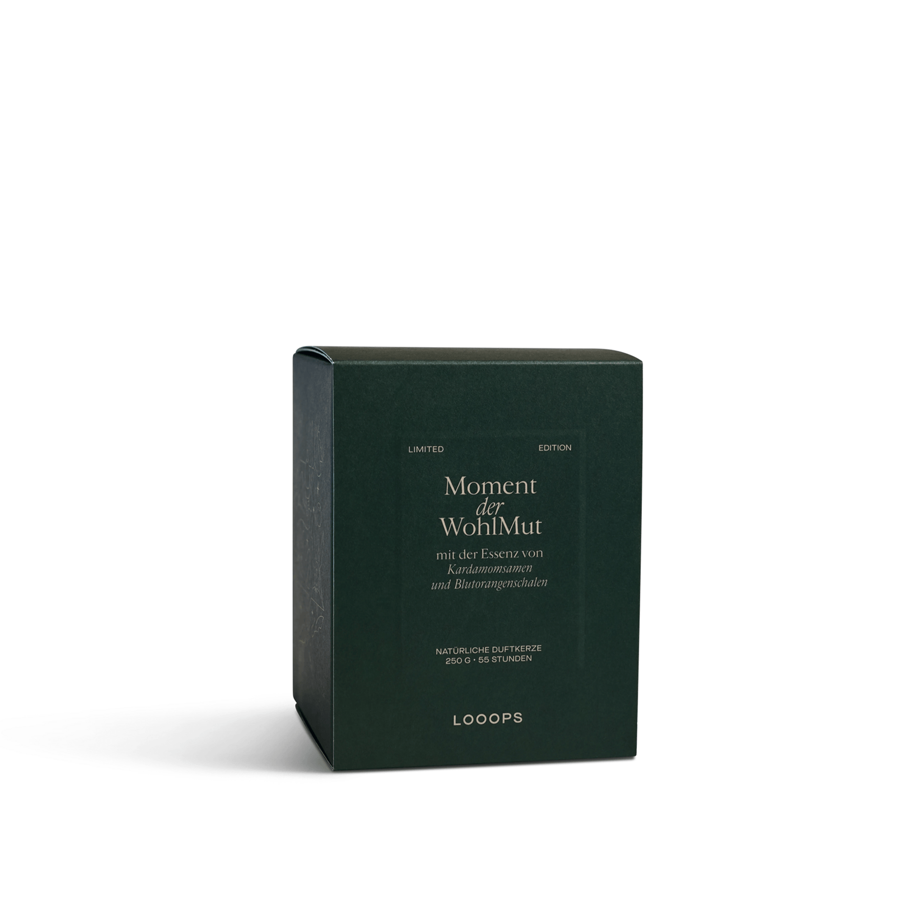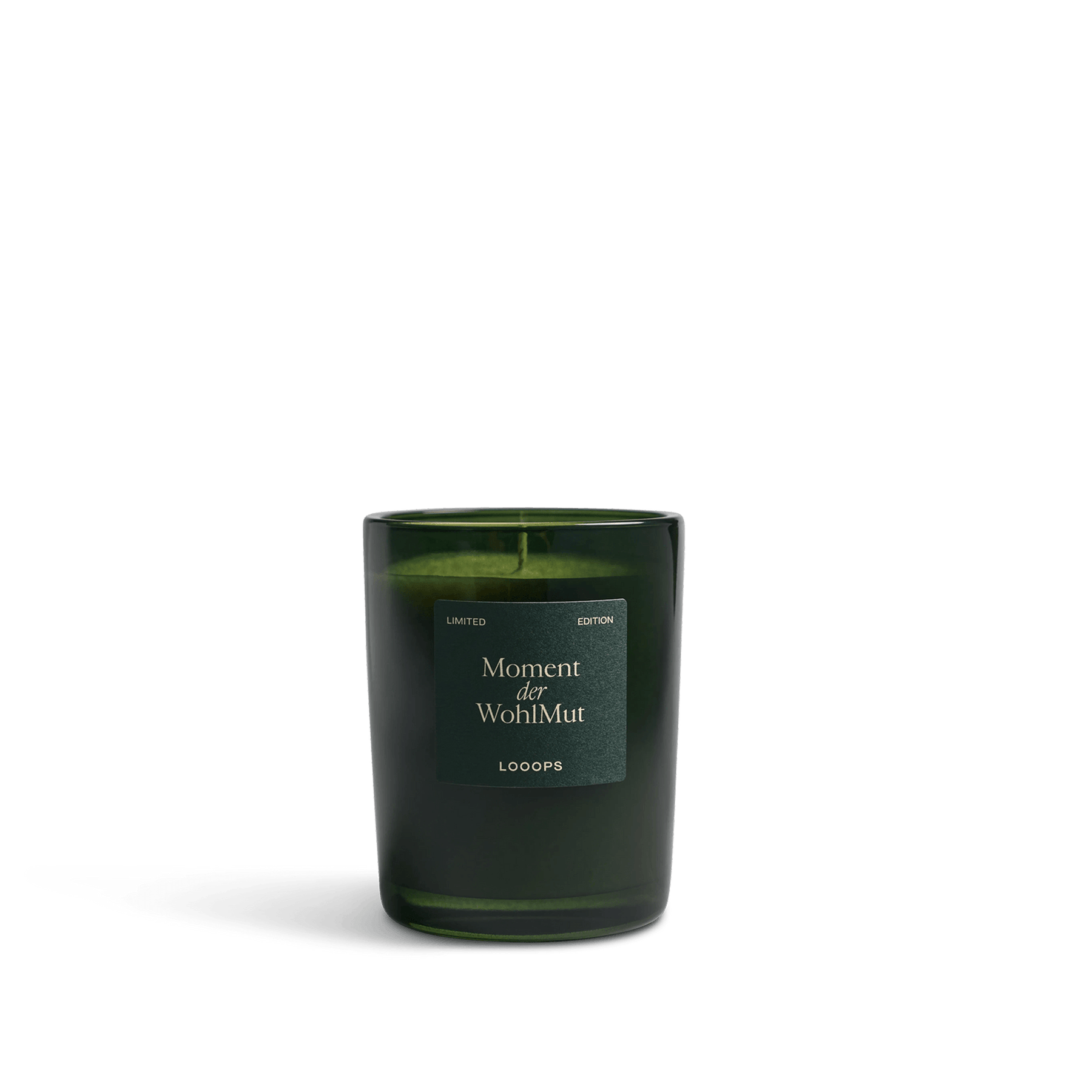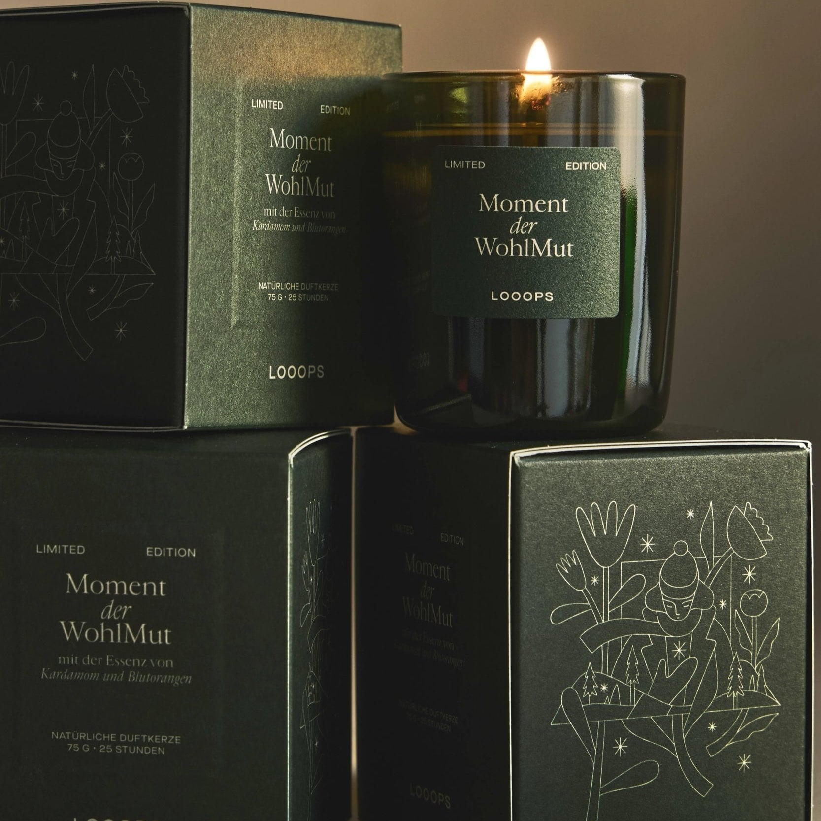 Limited winter edition in 250g – Original Looops candle jar with master's mark on the bottom , pine-green glass and pine-green packaging – with gold embossing, and a stained oak lid. Handmade in Salzburg