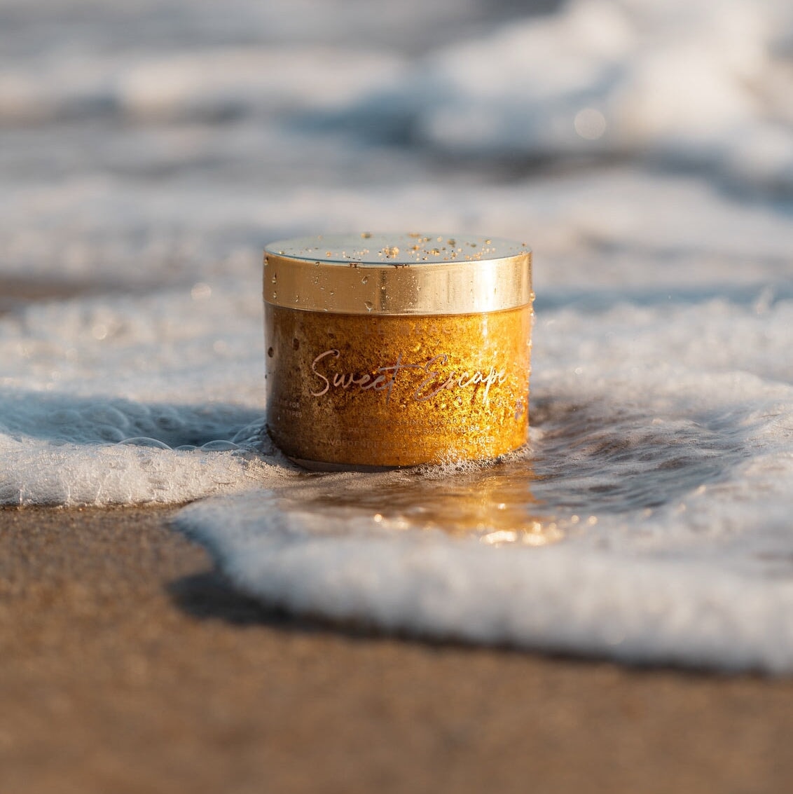 Entfliehe in den tropischen Urlaub mit Sweet Escape von Le Beach, dem nährenden Zucker-Peeling für Deinen Körper! Handgefertigt mit Zucker, Ölen, Butter und revitalisierendem Algenextrakt, um deine Haut zu peelen und zu verwöhnen. Tauche ein in die Essenz von Blumen und die belebende Frische der Minze und lass dich mit jedem Peeling in einen tropischen Urlaub entführen.
